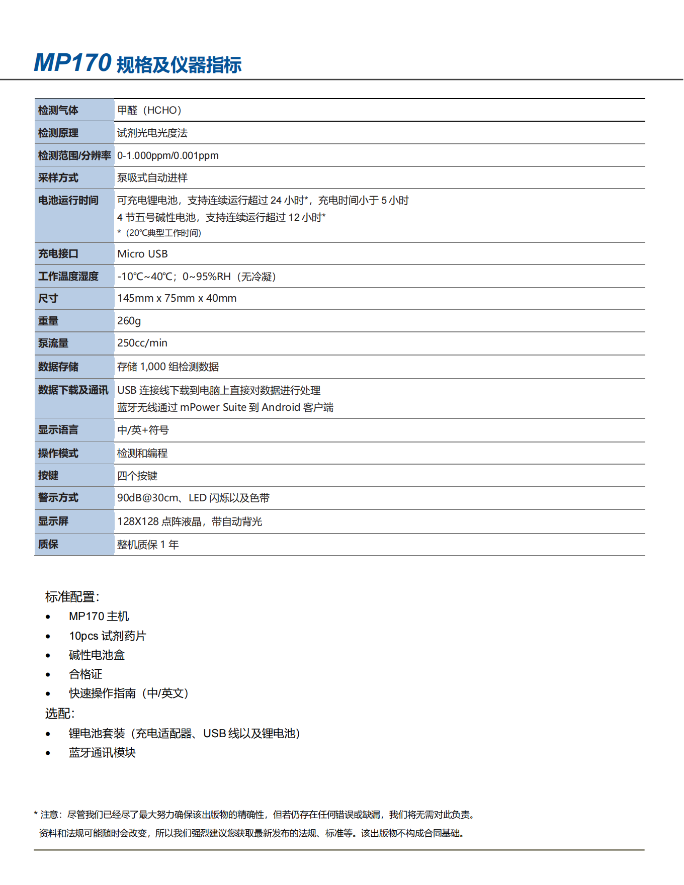 MP170 甲醛快速檢測(cè)儀是一款按照國(guó)家標(biāo)準(zhǔn)《GB/T 18204.2 公共衛(wèi)生場(chǎng)所檢驗(yàn)方法 第 2 部分:化學(xué)污染物》中7.4 光電光度法的標(biāo)準(zhǔn)要求設(shè)計(jì)的一款快速檢測(cè)設(shè)備。采用試劑藥片可以直接檢測(cè)空氣中甲醛的濃度,檢測(cè)時(shí)間短、無(wú)需長(zhǎng)時(shí)間暴露在現(xiàn)場(chǎng)環(huán)境中;設(shè)備自動(dòng)識(shí)別不同量程范圍試劑藥片,操作方便,無(wú)需專(zhuān)業(yè)實(shí)驗(yàn)室人員即可對(duì)甲醛進(jìn)行準(zhǔn)確快速檢測(cè);Micro-USB 充電方式,一次充電可以滿(mǎn)足超過(guò) 24 小時(shí)的連續(xù)檢測(cè);MP170 采用自動(dòng)背光 LCD顯示屏,支持多國(guó)語(yǔ)言并清晰可見(jiàn);MP170 可選擇藍(lán)牙模塊,將數(shù)據(jù)導(dǎo)出并實(shí)時(shí)編輯。工業(yè)級(jí)的外殼設(shè)計(jì),保證了產(chǎn)品穩(wěn)定性和一致性。MP170 可應(yīng)用在室內(nèi)空氣質(zhì)量、職業(yè)衛(wèi)生健康、建材、公共衛(wèi)生、環(huán)境保護(hù)、應(yīng)急檢測(cè)、建筑工程竣工驗(yàn)收等領(lǐng)域,是甲醛快速準(zhǔn)確檢測(cè)的不二選擇。