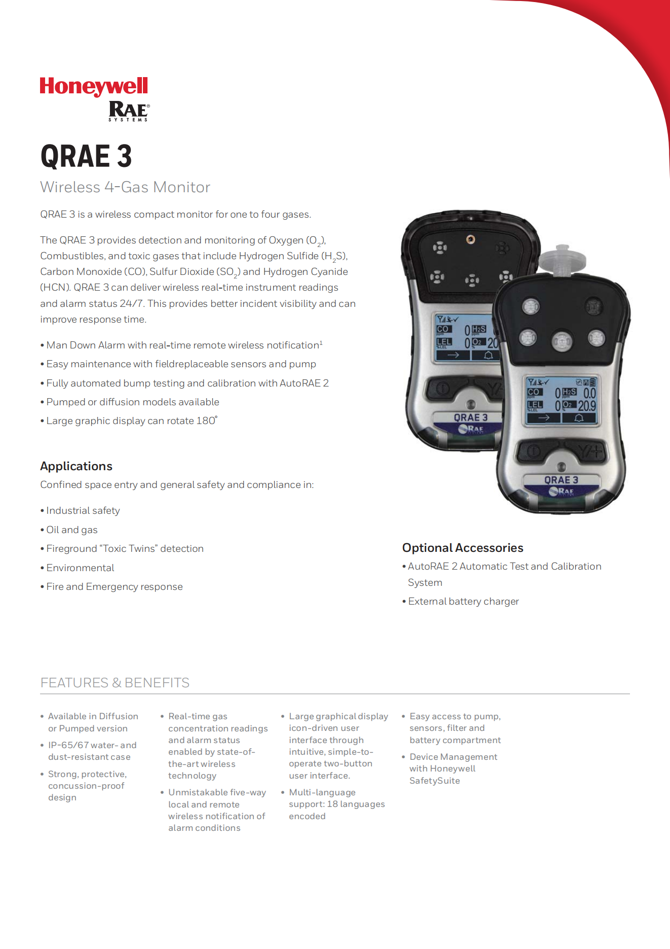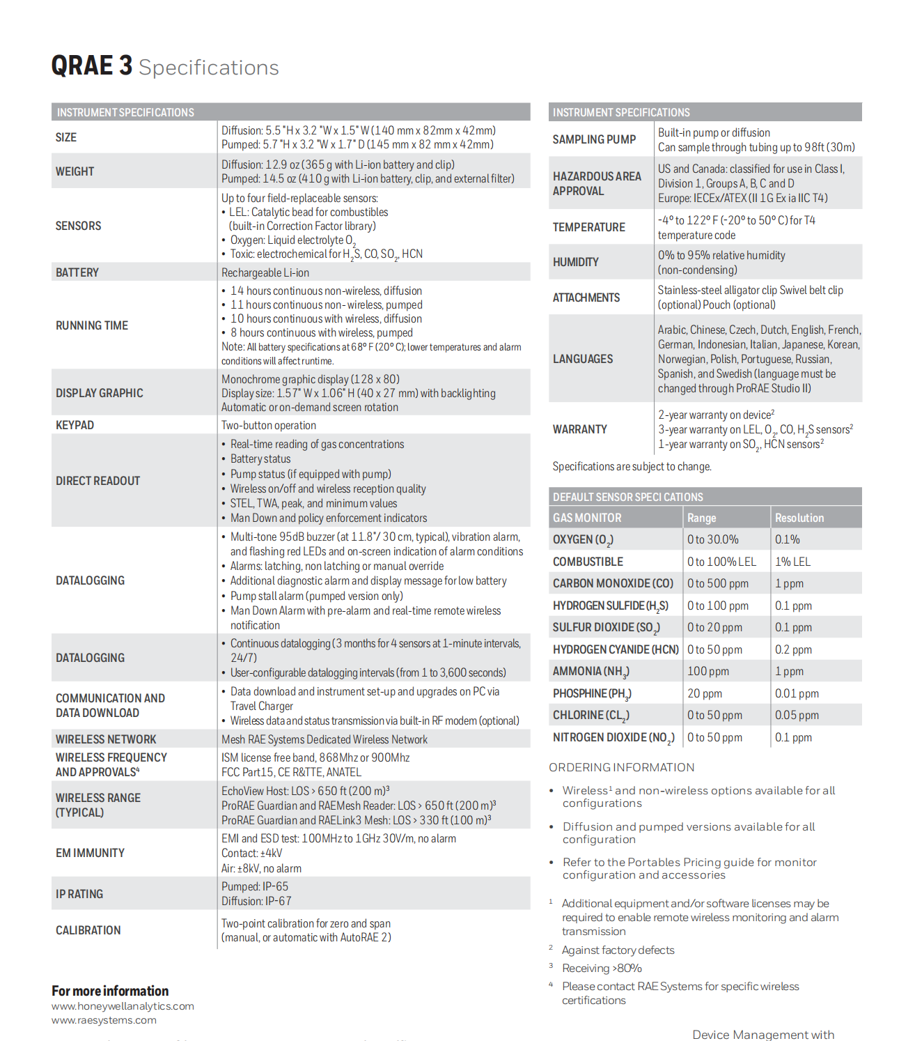 QRAE 3 is a wireless compact monitor for one to four gases. The QRAE 3 provides detection and monitoring of Oxygen (O2), Combustibles, and toxic gases that include Hydrogen Sulfide (H2S), Carbon Monoxide (CO), Sulfur Dioxide (SO2) and Hydrogen Cyanide (HCN). QRAE 3 can deliver wireless real-time instrument readings and alarm status 24/7. This provides better incident visibility and can improve response time.