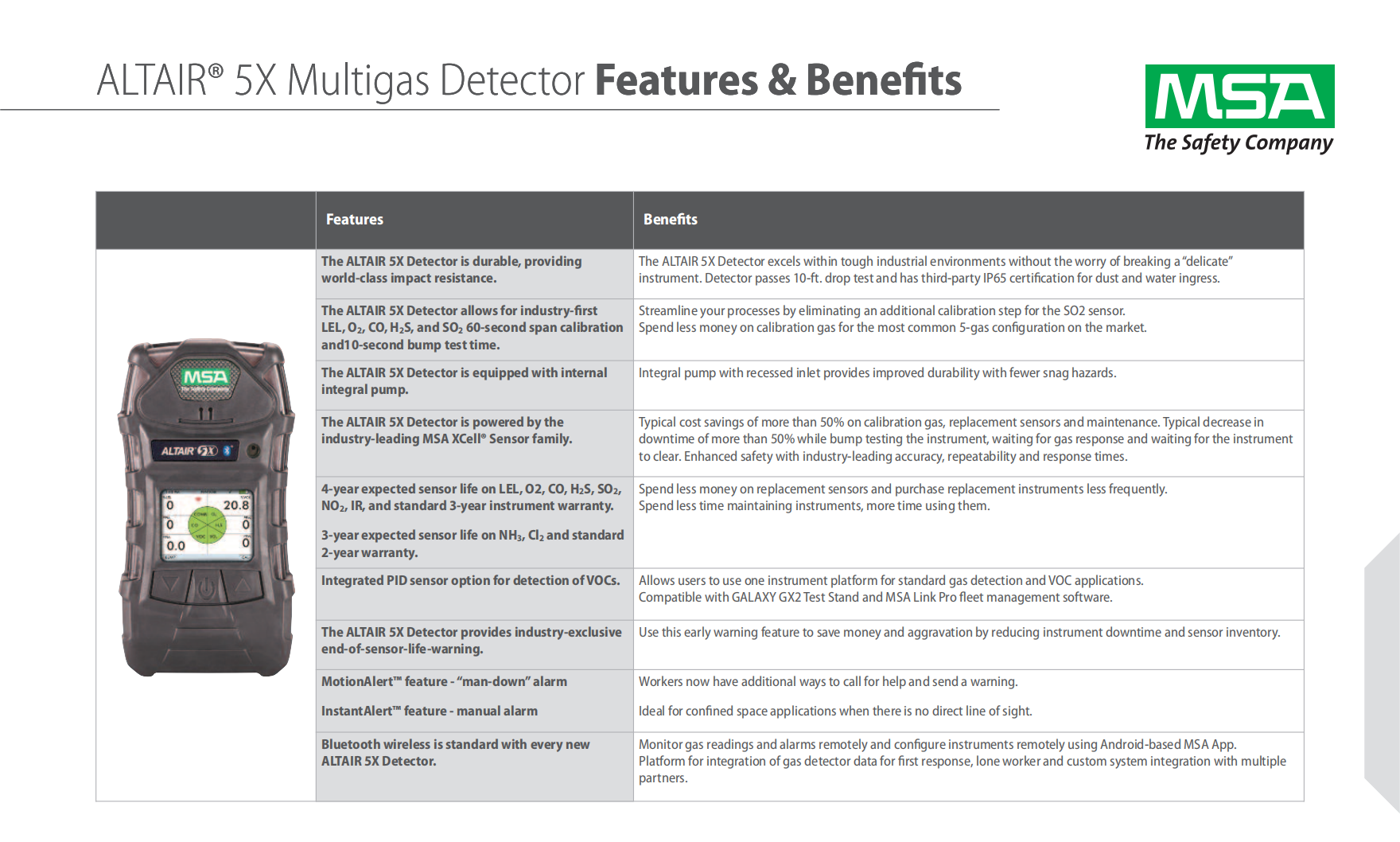 MSA ALTAIR 5X Gas Detector measures up to 6 gases including natural gas. Now available with a PID Detector The ALTAIR 5X Gas Detector is capable of measuring up to 6 gases simultaneously and is now available with integrated PID sensor for VOC detection. Driven by advanced MSA XCell? Sensor Technology, the ALTAIR 5X Gas Detector delivers faster response time, better stability, accuracy, longer service life, and cost savings over the life of the instrument.