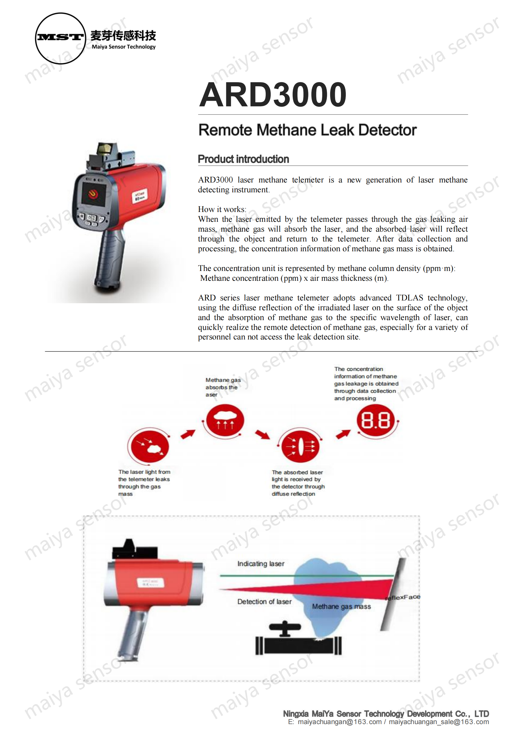 ARD series laser methane telemeter adopts advanced TDLAS technology, using the diffuse reflection of the irradiated laser on the surface of the object and the absorption of methane gas to the specific wavelength of laser, can quickly realize the remote detection of methane gas, especially for a variety of personnel can not access the leak detection site.