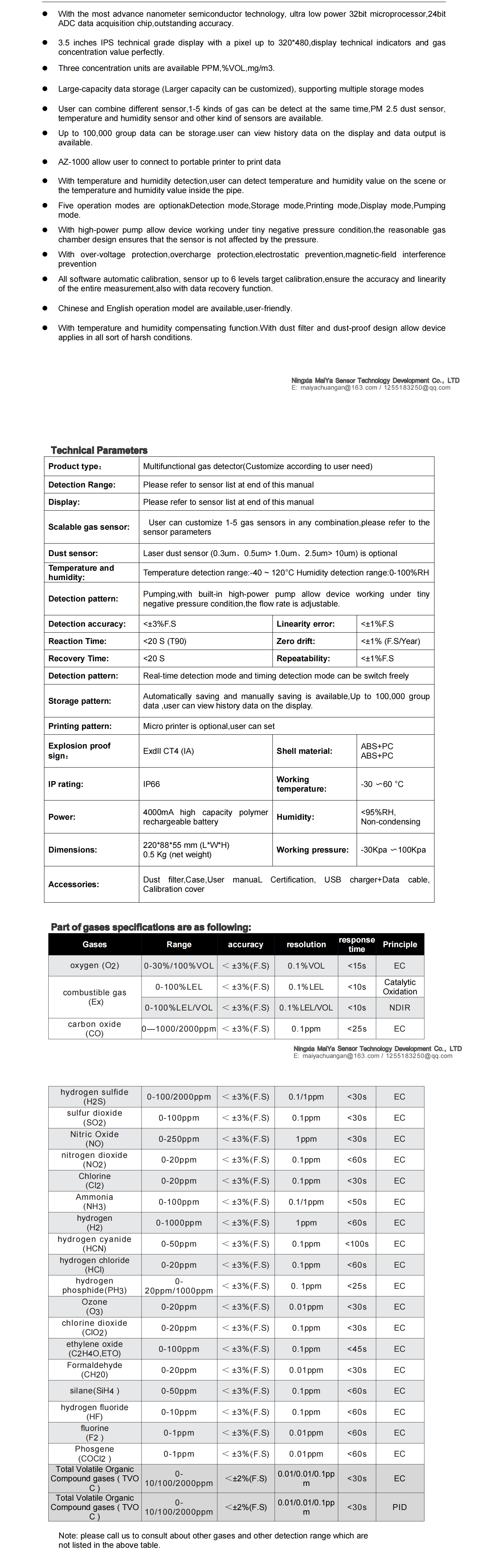 User can custom setting all parameters to ensure the operations are user-friendly,4000mA built-in high capacity polymer rechargeable battery,technical indicators,gas concentrations and history data can be display in the 3.5 inches IPS technical grade screen,User can save concentration data.output data,print and output data,detect temperature and humidity level.