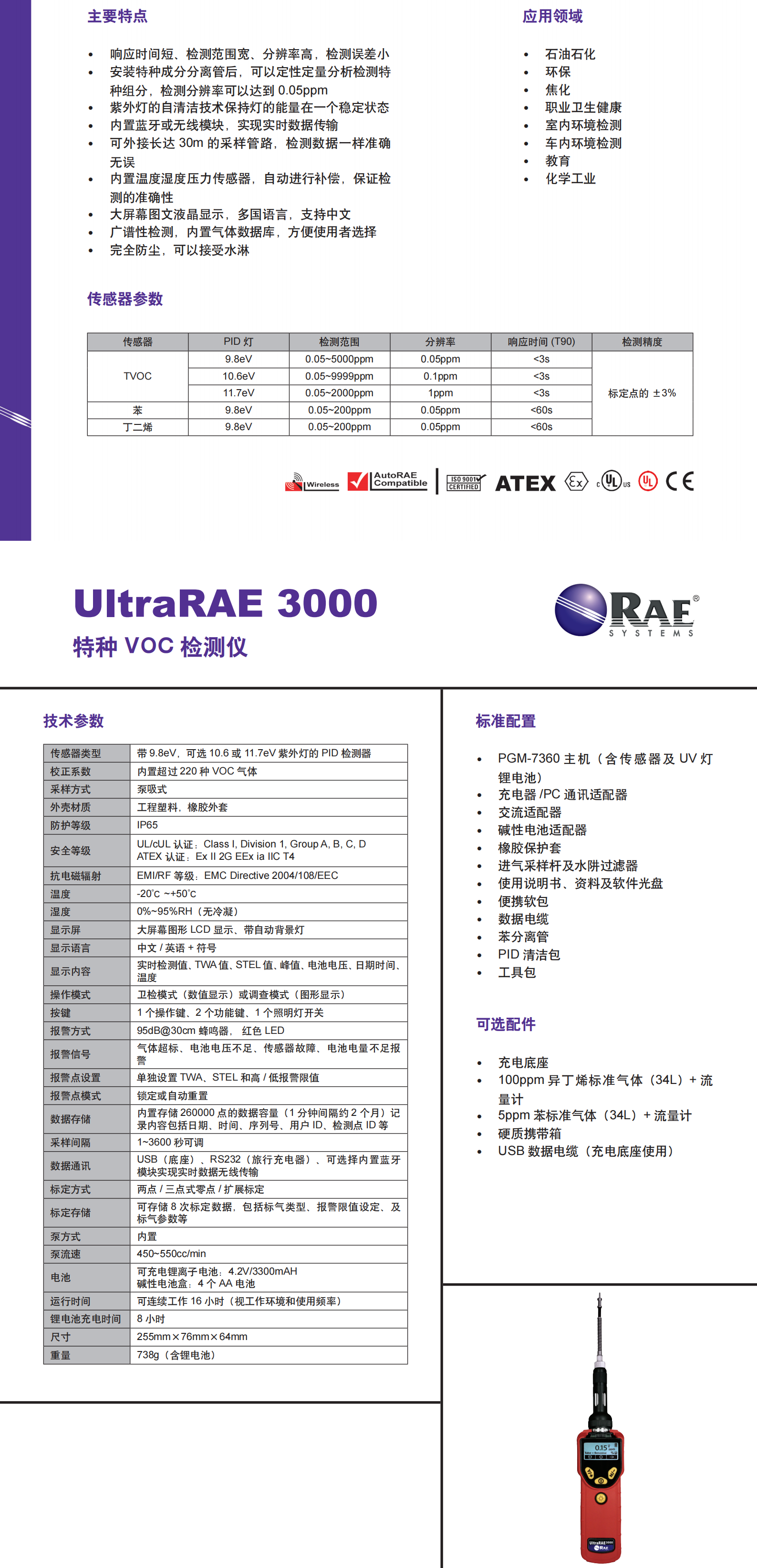 UltraRAE3000是一款基于3GPID平臺(tái)的特種有機(jī)氣體檢測(cè)的手持式VOC檢測(cè)儀,它使用帶9.8eV或10.6eV氣體放電燈的光離子化檢測(cè)器(PID),與獨(dú)特的RAE-SEP氣體分離管結(jié)合將待測(cè)組分分離,使檢測(cè)更具針對(duì)性,也可配合專門的分離管作為廣譜VOC檢測(cè)器進(jìn)行總揮發(fā)性有機(jī)化合物(TVOC)檢測(cè)??蓮V泛的應(yīng)用在環(huán)保、職業(yè)衛(wèi)生健康、工業(yè)安全、石油石化等行業(yè)。