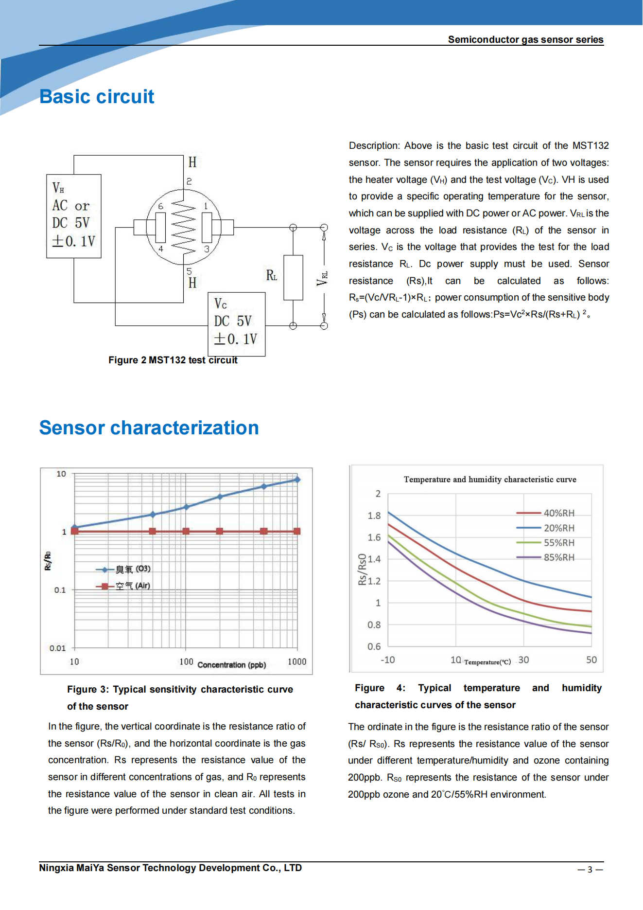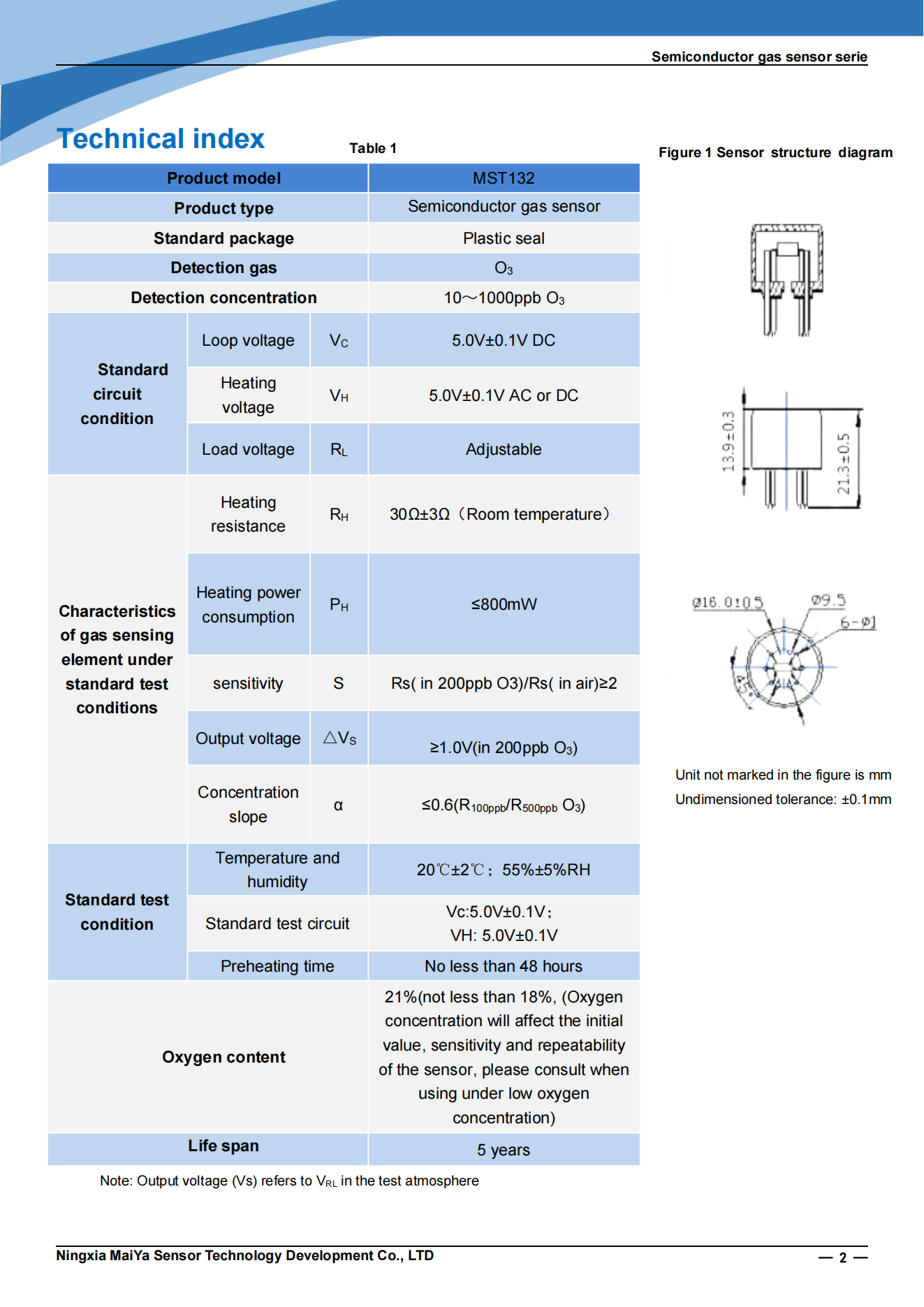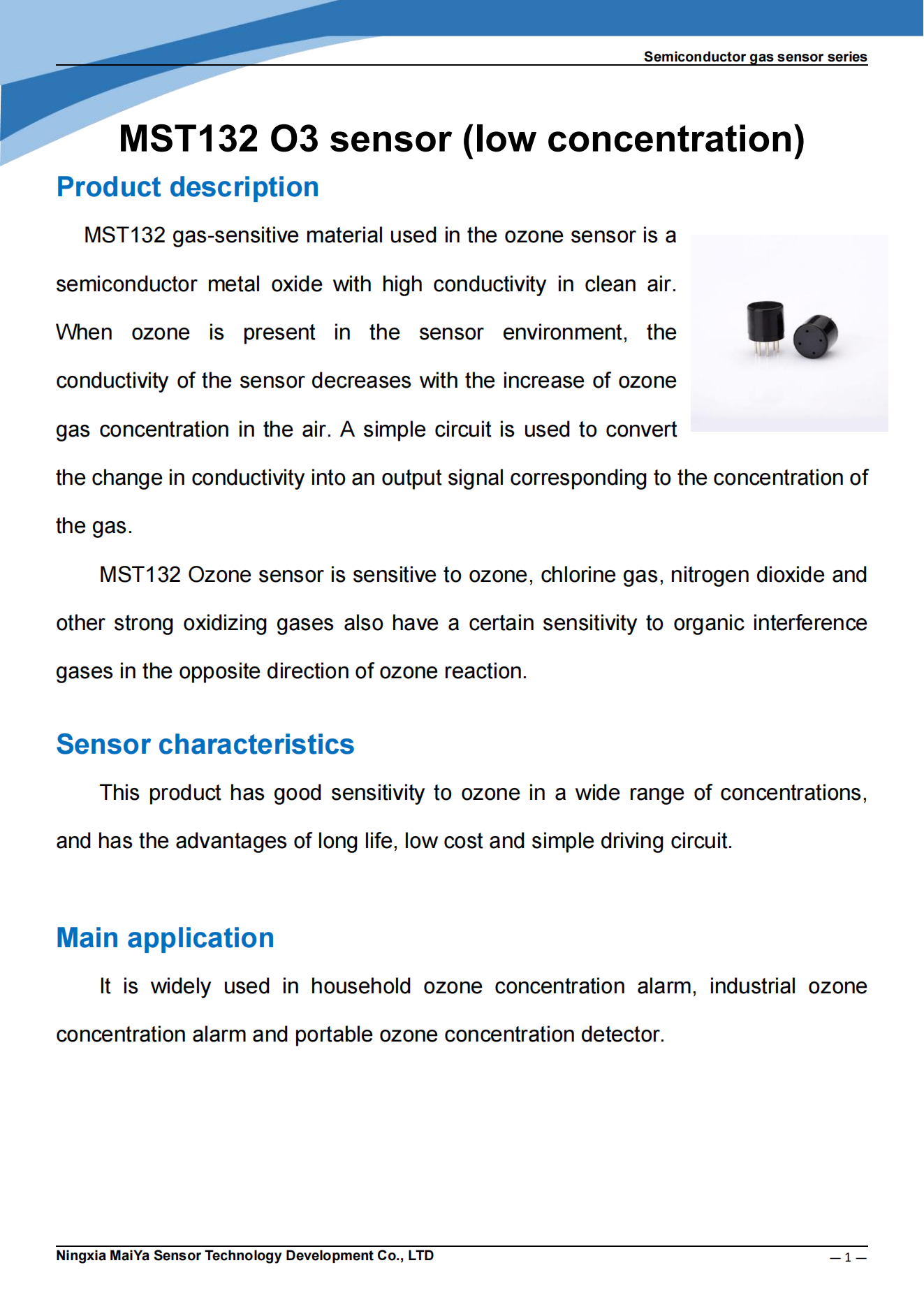 MST132 gas-sensitive material used in the ozone sensor is a semiconductor metal oxide with high conductivity in clean air. When ozone is present in the sensor environment, the conductivity of the sensor decreases with the increase of ozone gas concentration in the air. A simple circuit is used to convert the change in conductivity into an output signal corresponding to the concentration of the gas.