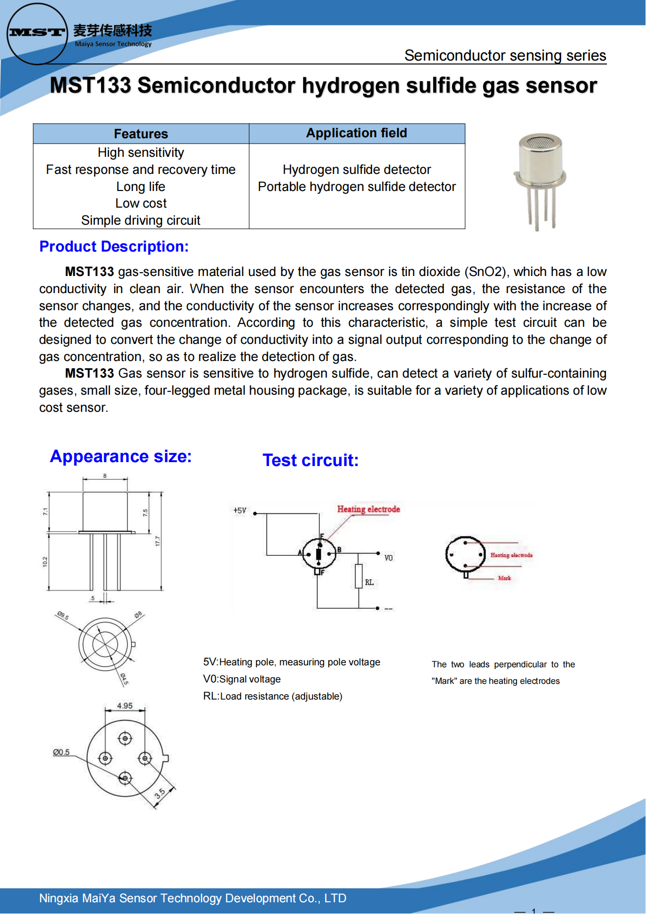 MST133 gas-sensitive material used by the gas sensor is tin dioxide (SnO2), which has a low conductivity in clean air. When the sensor encounters the detected gas, the resistance of the sensor changes, and the conductivity of the sensor increases correspondingly with the increase of the detected gas concentration. According to this characteristic, a simple test circuit can be designed to convert the change of conductivity into a signal output corresponding to the change of gas concentration, so as to realize the detection of gas.