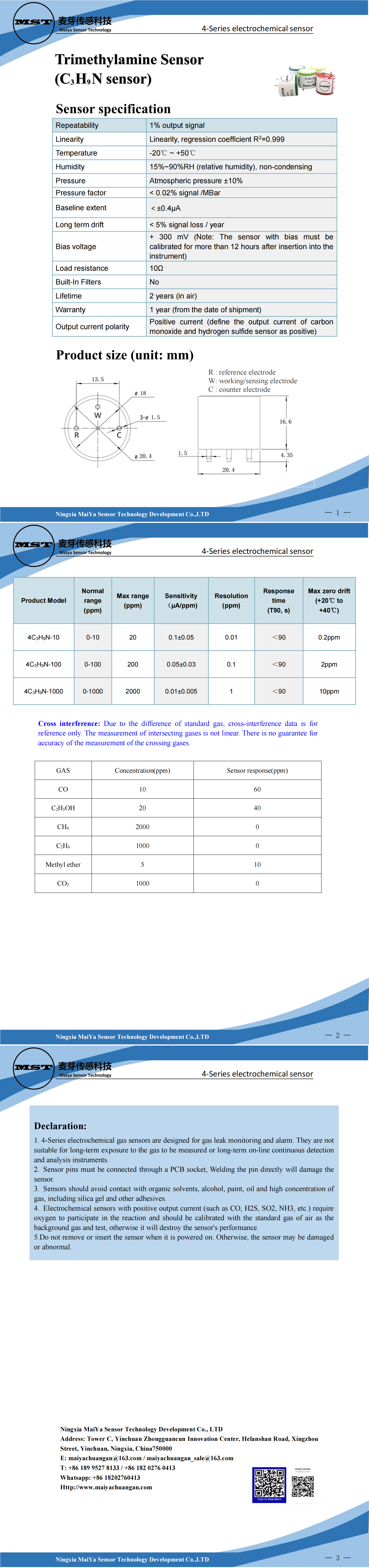 4-Series electrochemical gas sensors are designed for gas leak monitoring and alarm. They are not suitable for long-term exposure to the gas to be measured or long-term on-line continuous detection and analysis instruments.