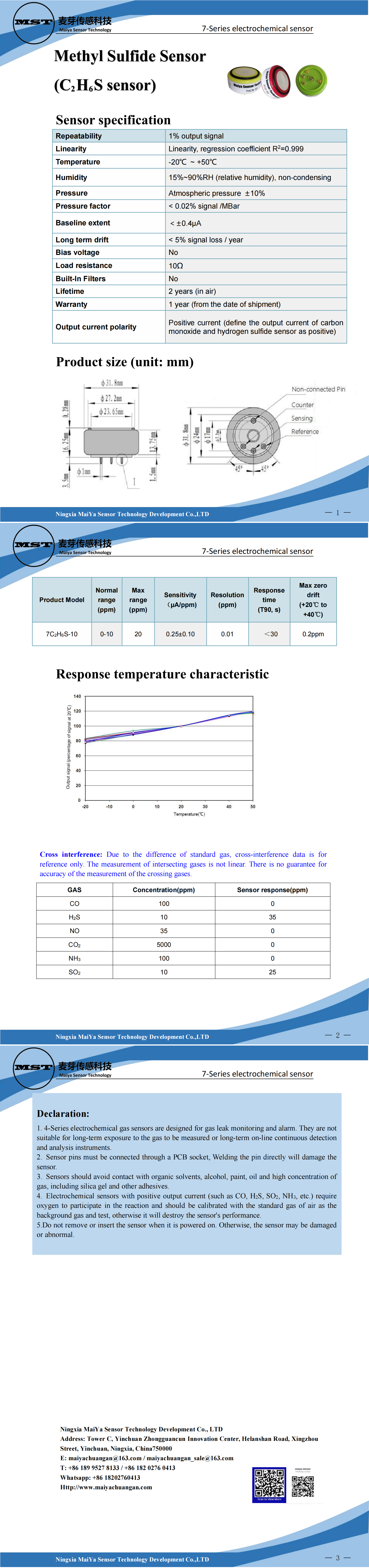 7-Series electrochemical gas sensors are designed for gas leak monitoring and alarm. They are not suitable for long-term exposure to the gas to be measured or long-term on-line continuous detection and analysis instruments.