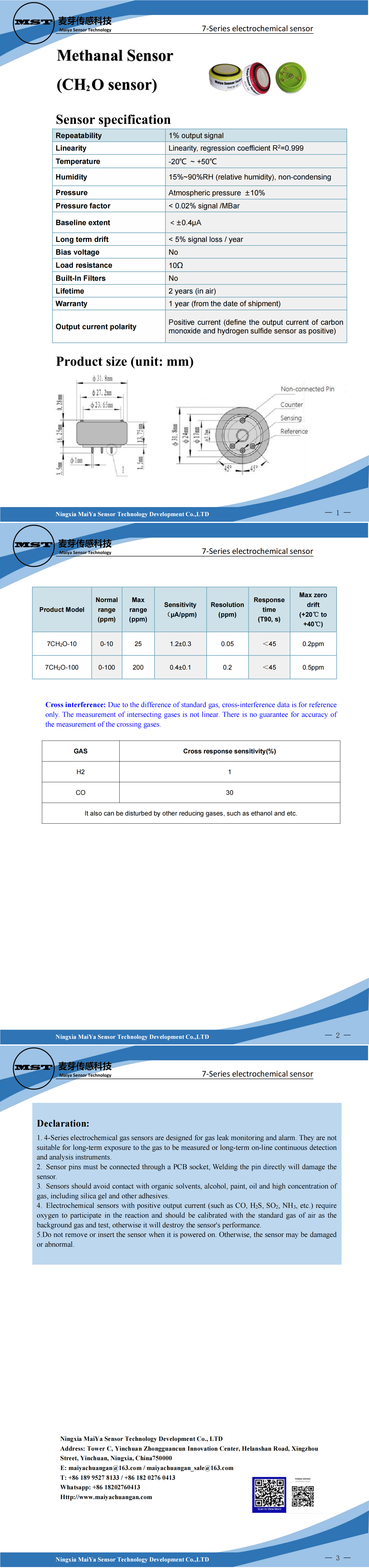 7-Series electrochemical gas sensors are designed for gas leak monitoring and alarm. They are not suitable for long-term exposure to the gas to be measured or long-term on-line continuous detection and analysis instruments.