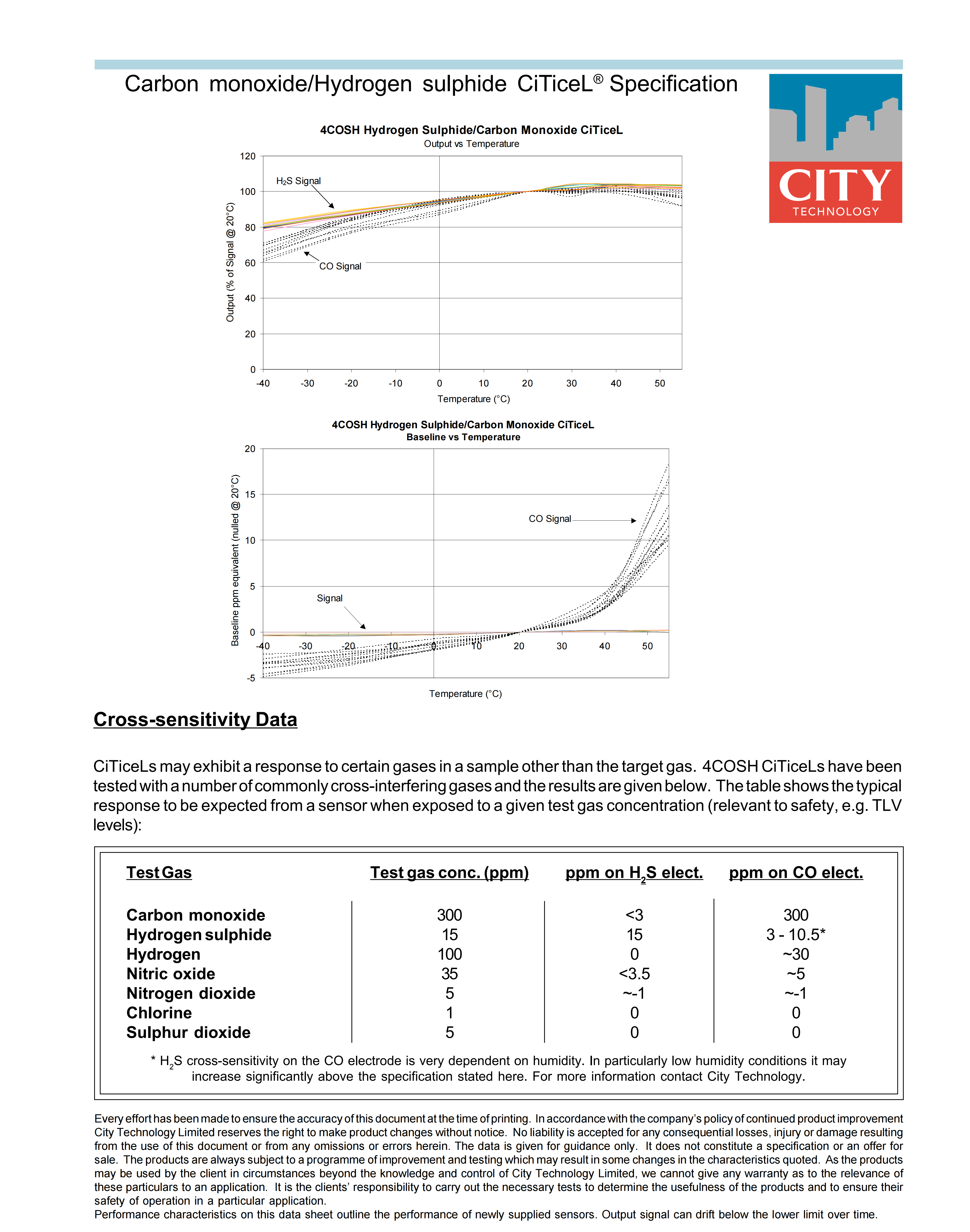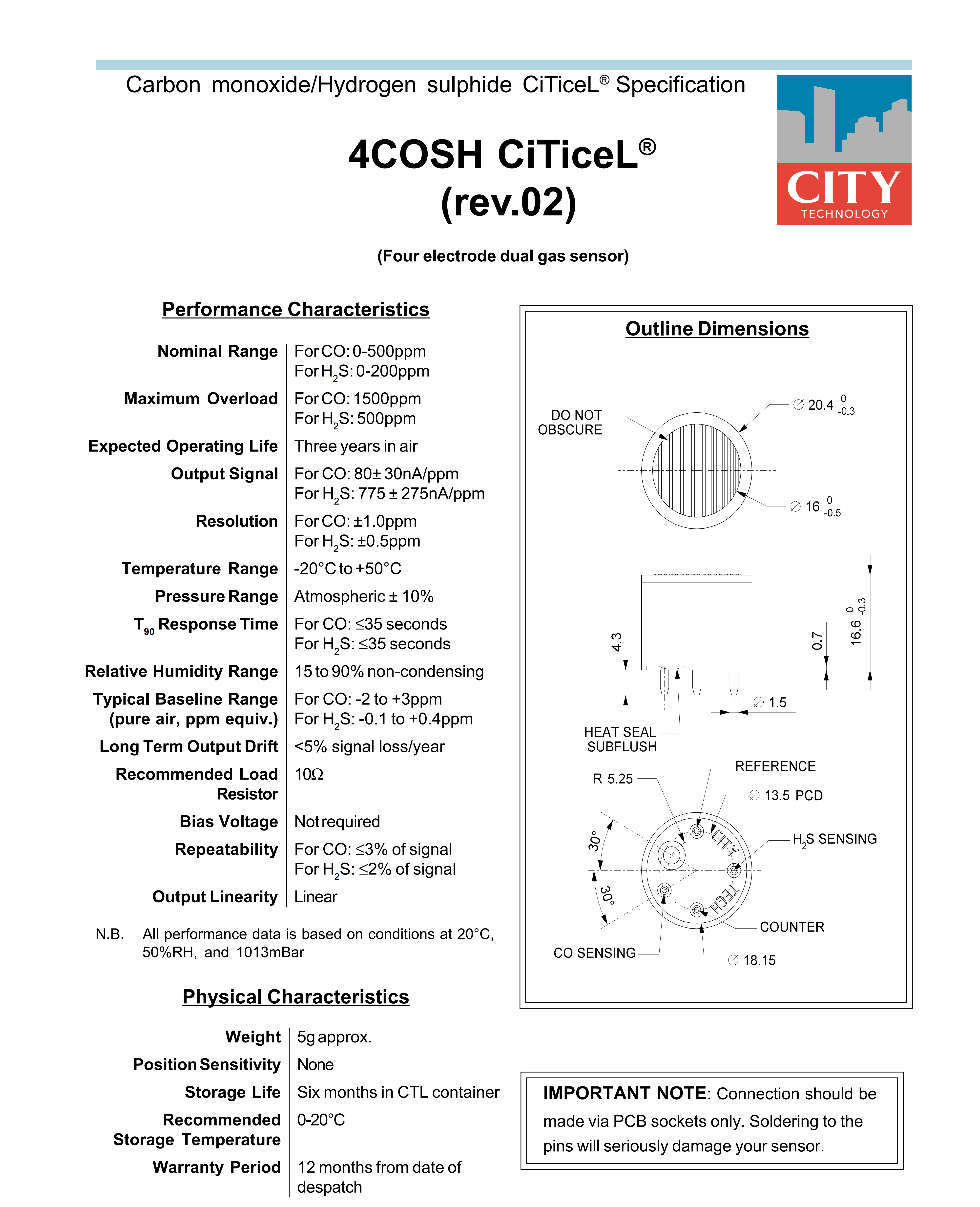Four electrode dual gas sensor Nominal Range: For CO: 0-500ppm For H2S: 0-200ppm