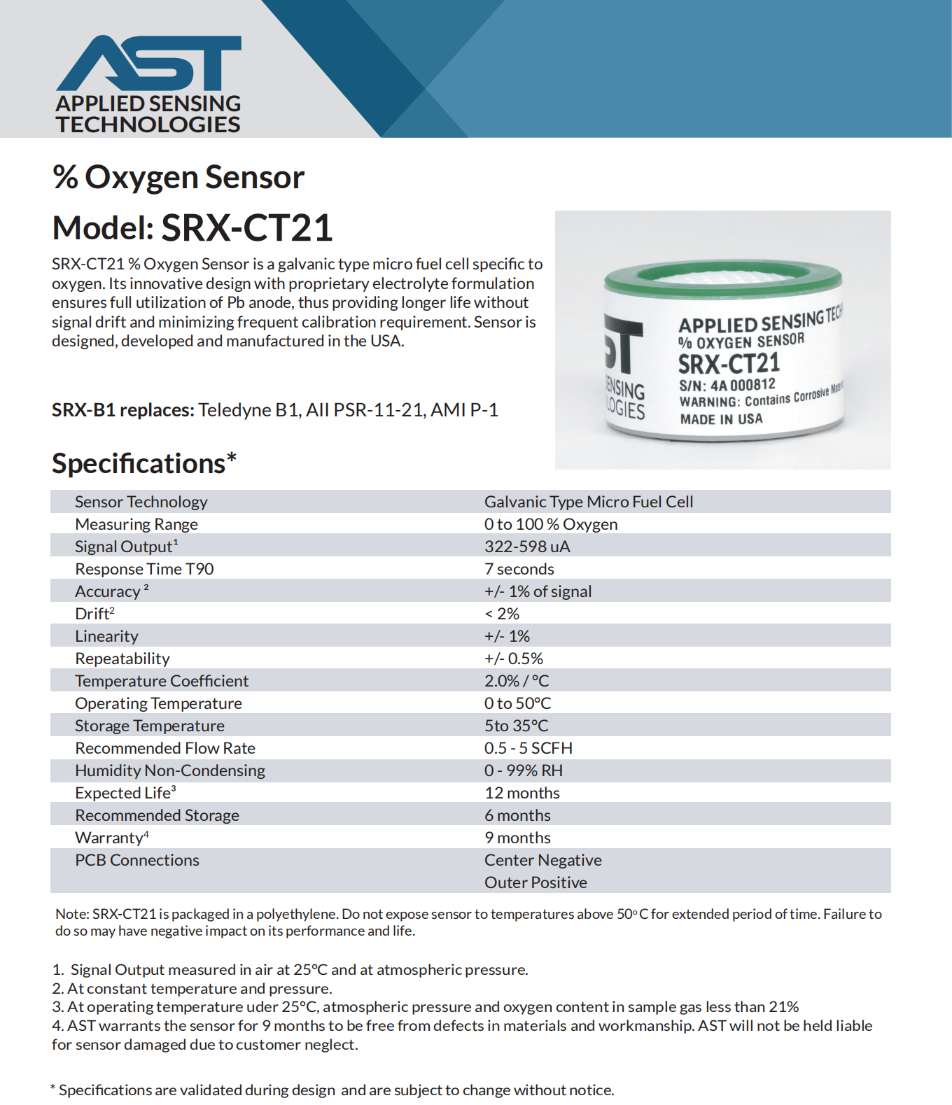 SRX-CT21 % Oxygen Sensor is a galvanic type micro fuel cell specific to oxygen. Its innovative design with proprietary electrolyte formulation ensures full utilization of Pb anode, thus providing longer life without signal drift and minimizing frequent calibration requirement.