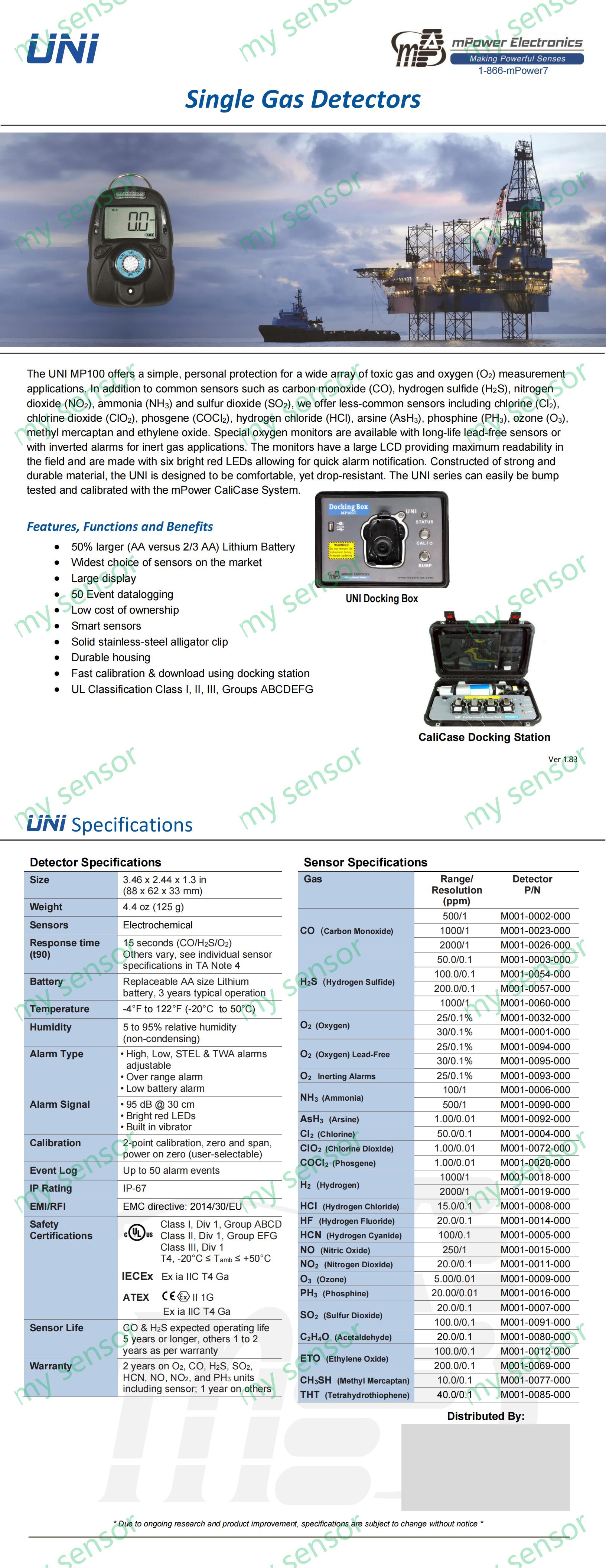 The UNI MP100 offers a simple, personal protection for a wide array of toxic gas and oxygen (O2) measurement applications. In addition to common sensors such as carbon monoxide (CO), hydrogen sulfide (H2S), nitrogen dioxide (NO2), ammonia (NH3) and sulfur dioxide (SO2), we offer less-common sensors including chlorine (Cl2), chlorine dioxide (ClO2), phosgene (COCl2), hydrogen chloride (HCl), arsine (AsH3), phosphine (PH3), ozone (O3), methyl mercaptan and ethylene oxide. Special oxygen monitors are available with long-life lead-free sensors or with inverted alarms for inert gas applications. The monitors have a large LCD providing maximum readability in the field and are made with six bright red LEDs allowing for quick alarm notification. Constructed of strong and durable material, the UNI is designed to be comfortable, yet drop-resistant. The UNI series can easily be bump tested and calibrated with the mPower CaliCase System.
