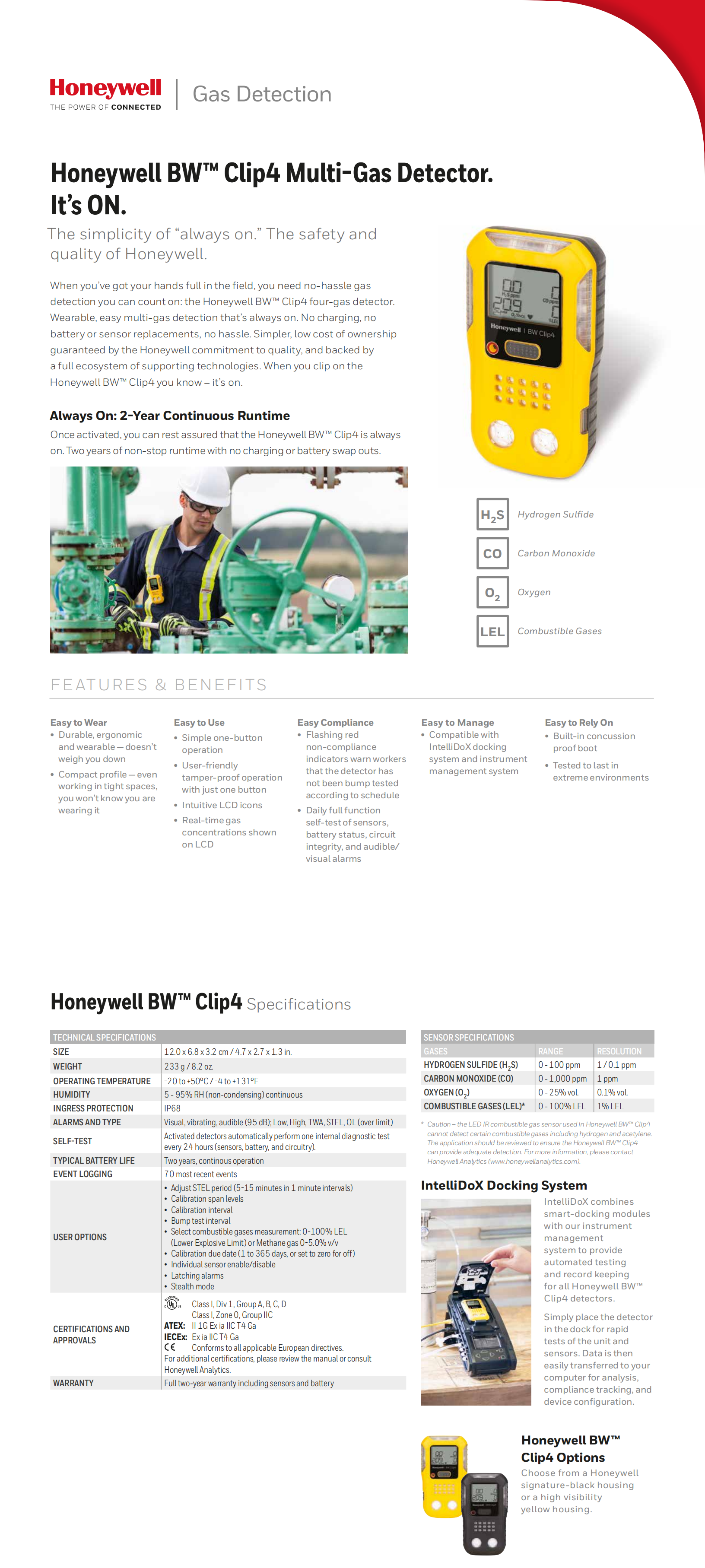 Wearable, easy multi-gas detection that’s always on. No charging, no battery or sensor replacements, no hassle. Simpler, low cost of ownership guaranteed by the Honeywell commitment to quality, and backed by a full ecosystem of supporting technologies. When you clip on the Honeywell BW? Clip4 you know – it’s on.