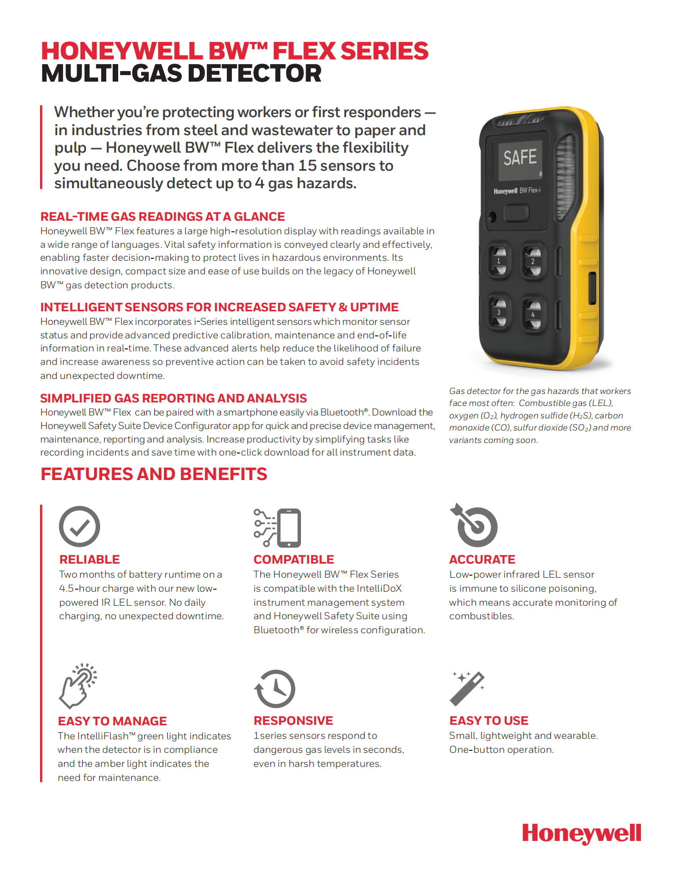 Whether you’re protecting workers or first responders — in industries from steel and wastewater to paper and pulp — Honeywell BW? Flex delivers the flexibility you need. Choose from more than 15 sensors to simultaneously detect up to 4 gas hazards.