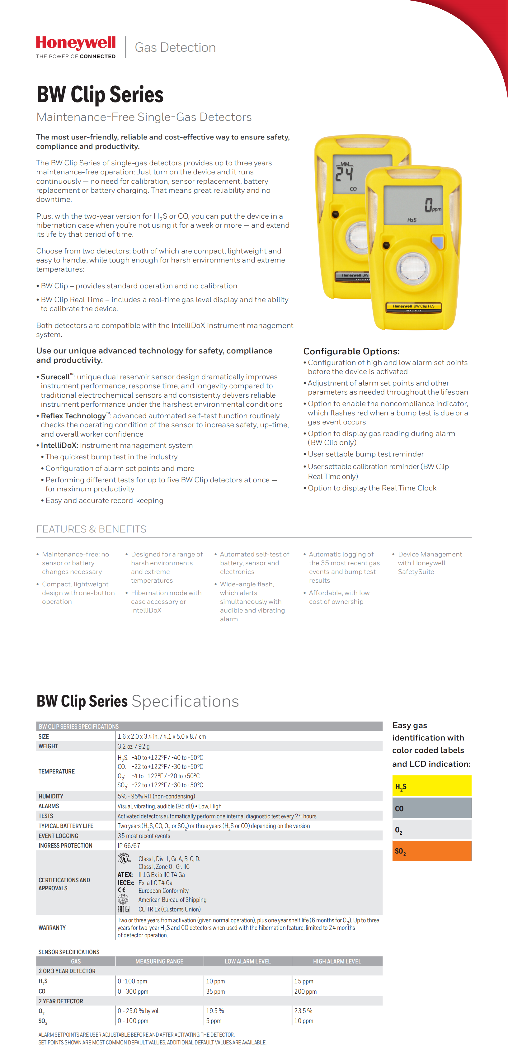 The BW Clip Series of single-gas detectors provides up to three years maintenance-free operation: Just turn on the device and it runs continuously — no need for calibration, sensor replacement, battery replacement or battery charging. That means great reliability and no downtime.
