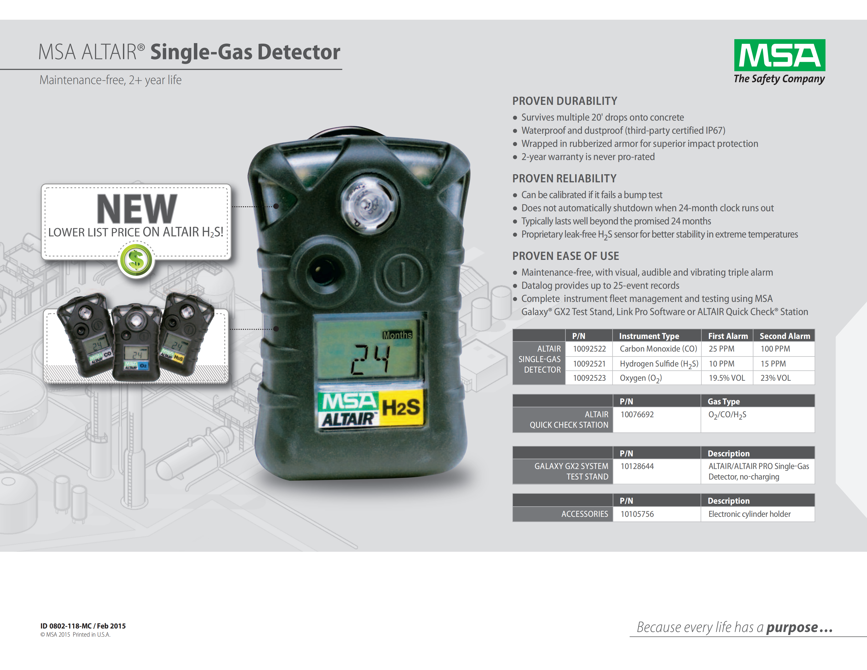 A cost-effective single-gas detector with a superior lifespan Designed for superior lifespan—patented sensors operate for over two years—and high performance, the ALTAIR Single-Gas Detector is the smart choice for market-leading, cost-effective gas monitors. Features sensor options for carbon monoxide, hydrogen sulfide, and oxygen coupled with LED/audible/vibrating alarms. Superior dust/water protection, high RFI resistance, and one-button operation provide heightened safety, plus increased durability and ease-of-use.