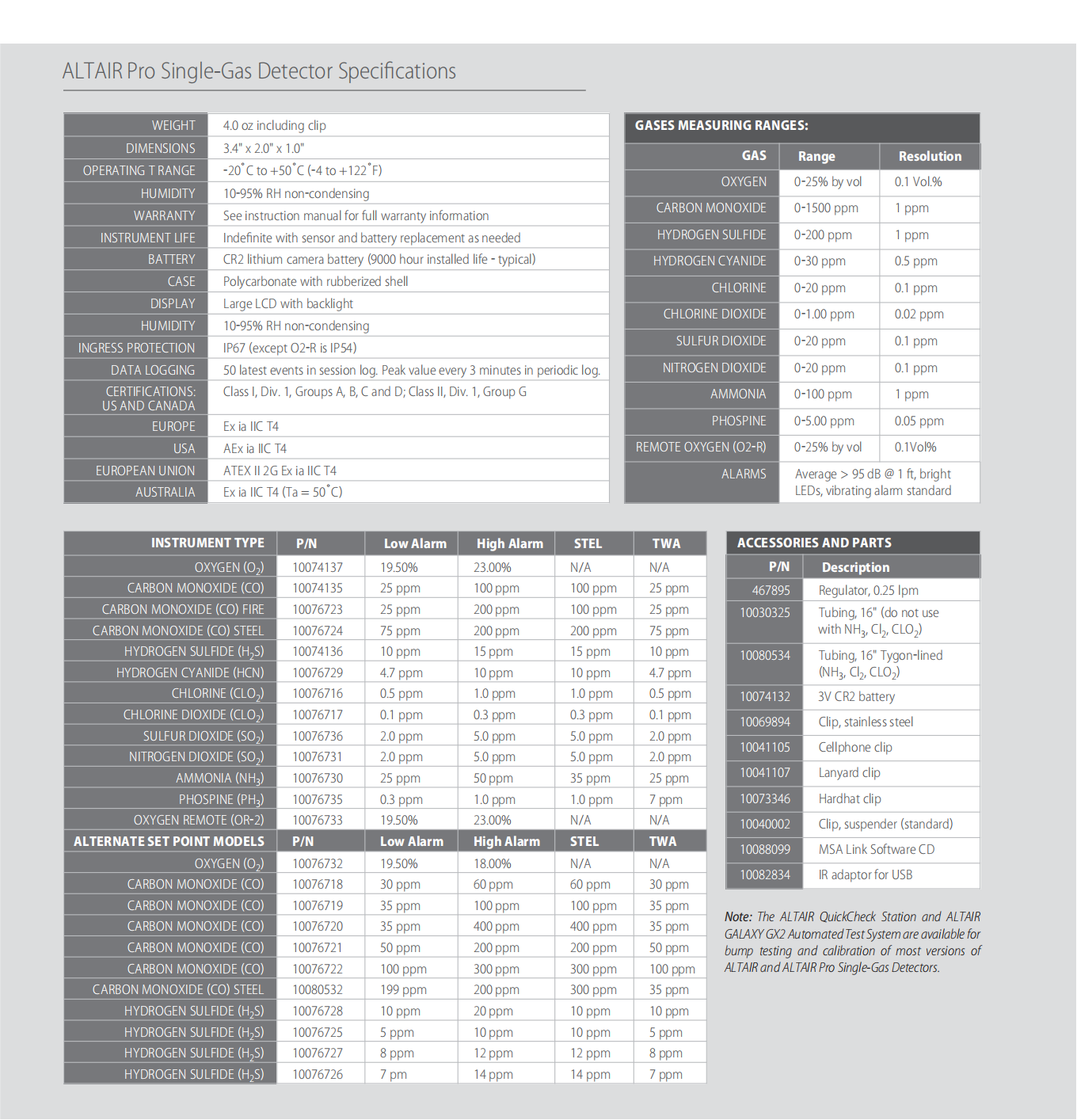 Based on the industry-standard ALTAIR Single-Gas Detector—but with added features and functionality—ALTAIR Pro toxic gas and oxygen detectors combine reliable detection and LED/audible/flashing/vibrating alarms with clear, backlit LCD displays. Electrochemical sensors measure concentrations of toxic gas (chlorine dioxide, hydrogen cyanide and phosphine) or percent oxygen. Purpose-built for superior dust and water protection, excellent impact resistance and excellent RFI performance.