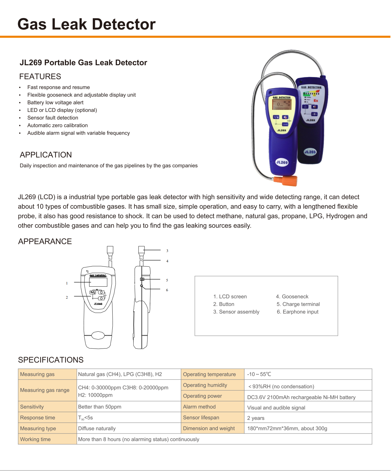Fast response and resume Flexible goose-neck Measuring gas: Natural gas (CH4), LPG (C3H8), H2 Sensitivity: Better than 50ppm Measuring type: Diffuse naturally Sensor life: 2 years